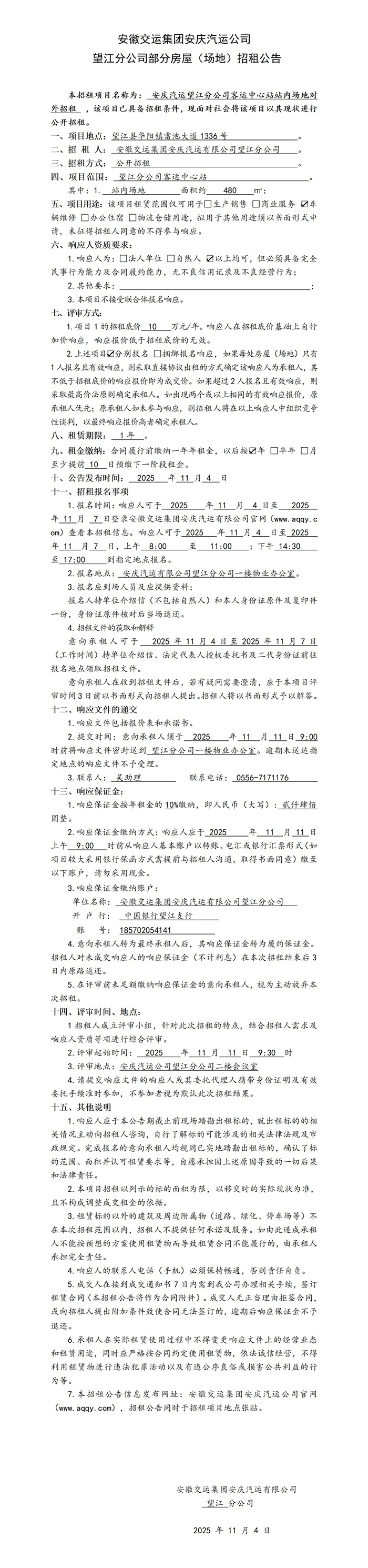 望江分公司部分房屋(场地)招租公告