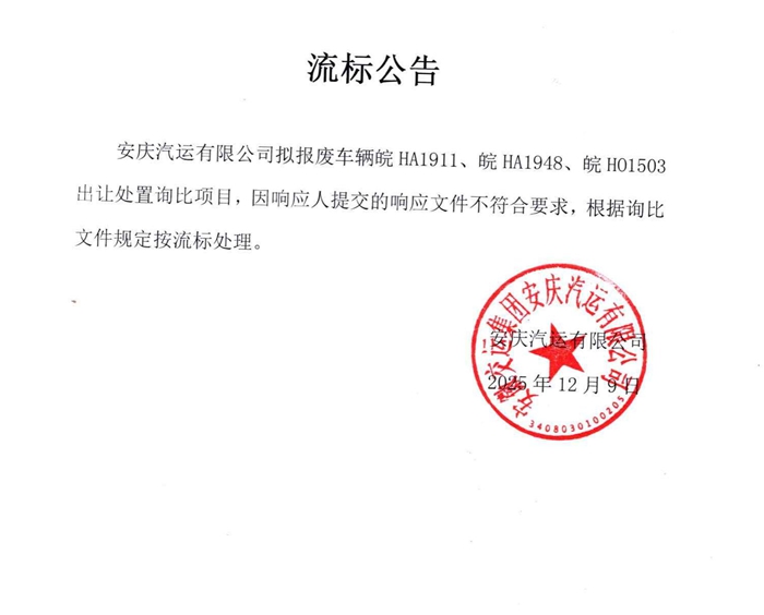 拟报废公务车皖HA1911、皖HA1948、皖HO1503出让处置流标公告