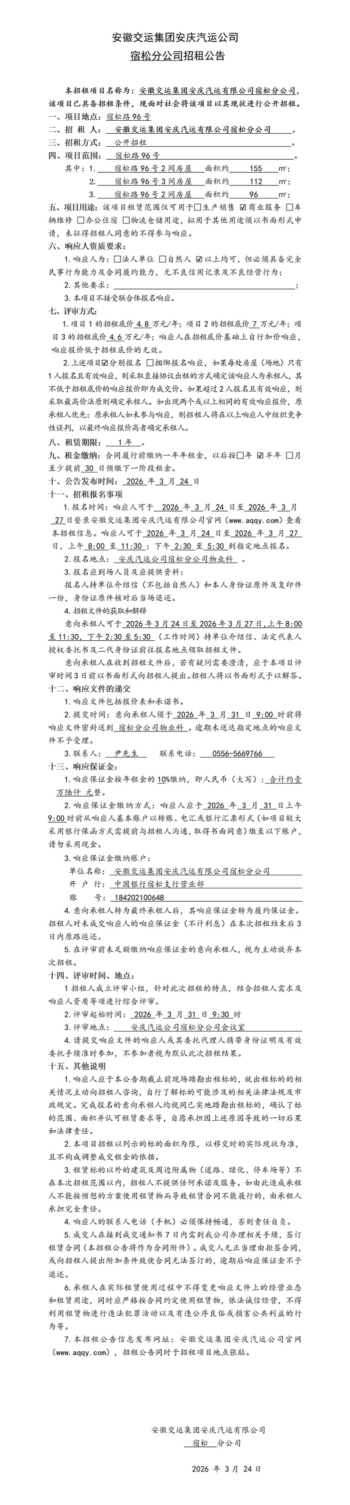 宿松分公司房屋(场地)招租公告