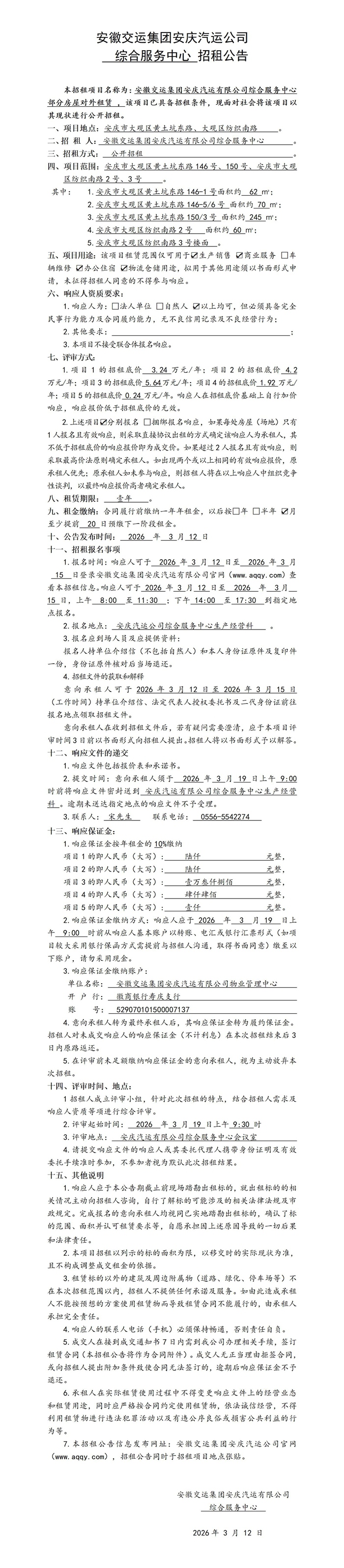 综合服务中心部分房屋对外租赁公告