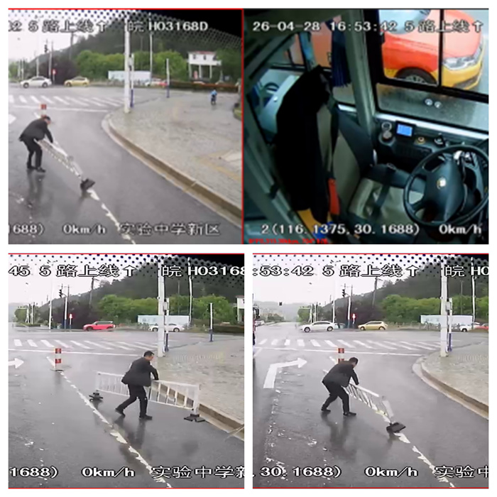 就在此时,宿松城市公交分公司5路公交车驾驶员刘师傅驾驶着皖H03168D公交车途经此地。他敏锐地察觉到路面倒伏护栏造成的潜在危险,立即采取应急措施。刘师傅稳稳把控方向盘,将公交车安全停靠在路边,并迅速打开车辆双闪警示灯,提醒后方来车注意避让。在确认车上乘客安全无虞后,他毅然决然地冒着倾盆大雨、顶着阵阵强风下车处置险情。