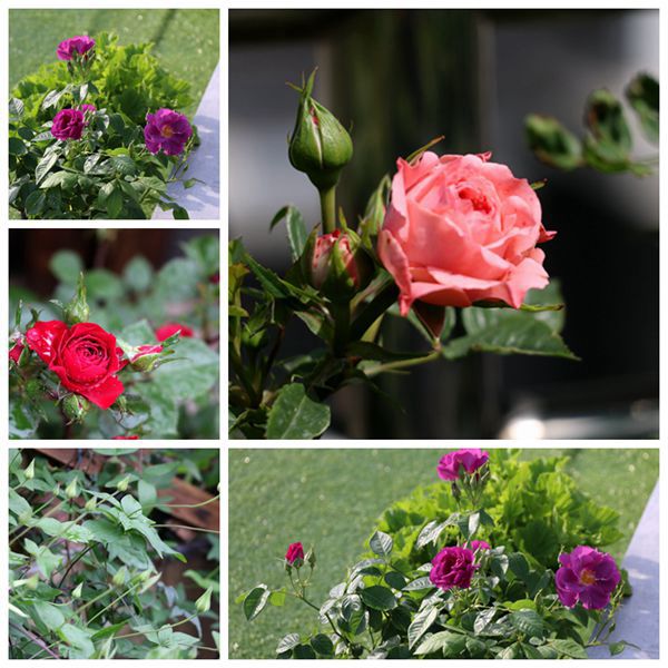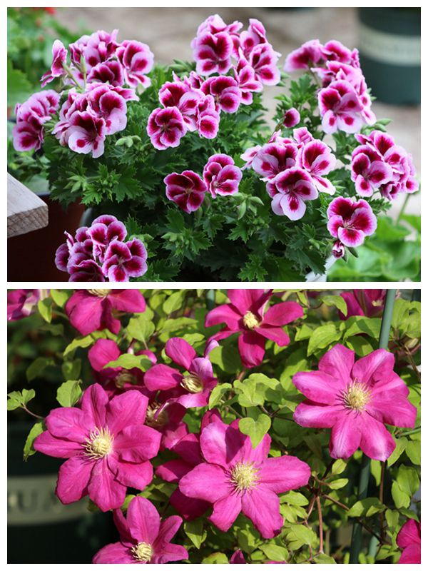 月季和铁线莲像一对亲密伴侣,相约开放。