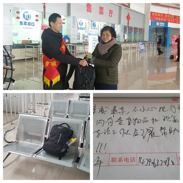 2月23日8时15分左右,桐城中心站学雷锋志愿服务岗前一位50多岁的中年阿姨满脸通红,心急如焚地说:“同志,你们有没有看到一只双肩包,我姐姐今早做苏州的车,上车时忘记拿了,里面还有七百多元钱。”工作人员王晨接待了阿姨:“阿姨别急,是黑色的双肩包吗?”“是的是的,你看见了吗?”王晨说早上帮助旅客运送行李,回来从6号门经过时,看见一只黑色的双肩包遗失在候车室的座位上,凭工作经验,这肯定是旅客落下的。他立即询问其他门号旅客,无人应答,就将包立刻交给服务台工作人员吴沙平,并喊来值班站长代泽燕,一起清点查找包中物品,看有没有联系方式。包内有外套二件,一些零食和日用品,在夹层内发现现金750元。查找联系方式未果,他们心里急,但是没办法,只有等了。随后就发生了开头的一幕,在清点物品无误后,阿姨接过失而复得的双肩包激动地说:“同志谢谢你,我是抱着试试的心理来的,没想到还真找到了,感谢你们!”