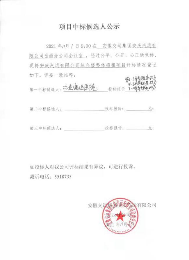 岳西分公司综合楼整体招租中标结果公示