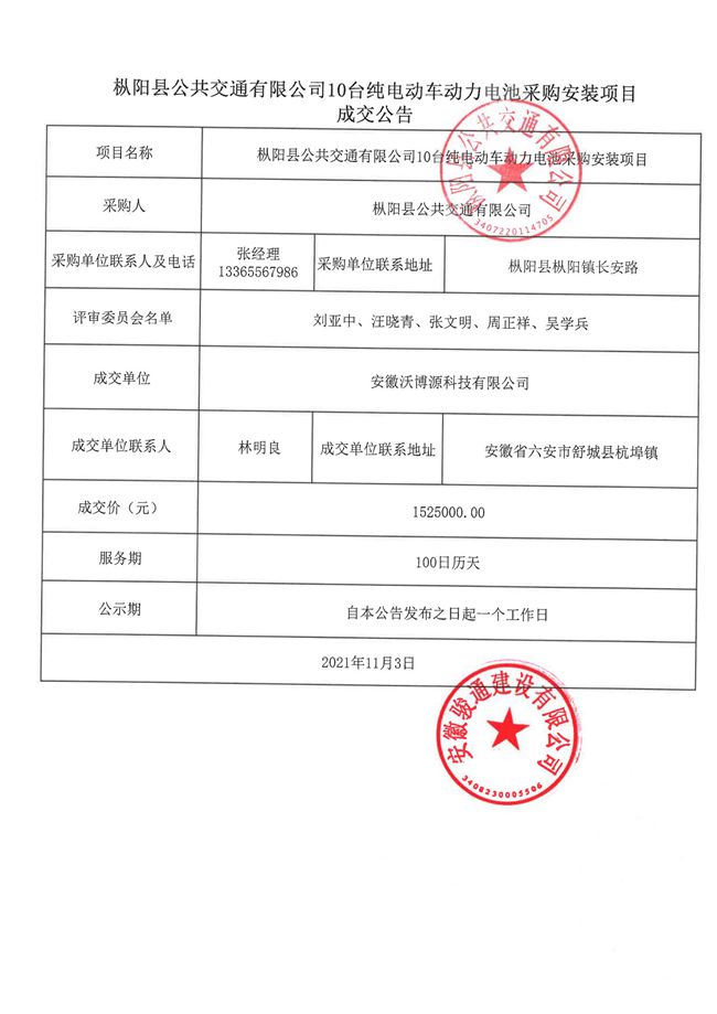 枞阳公共交通有限公司10台纯电动车电池采购安装项目成交公告