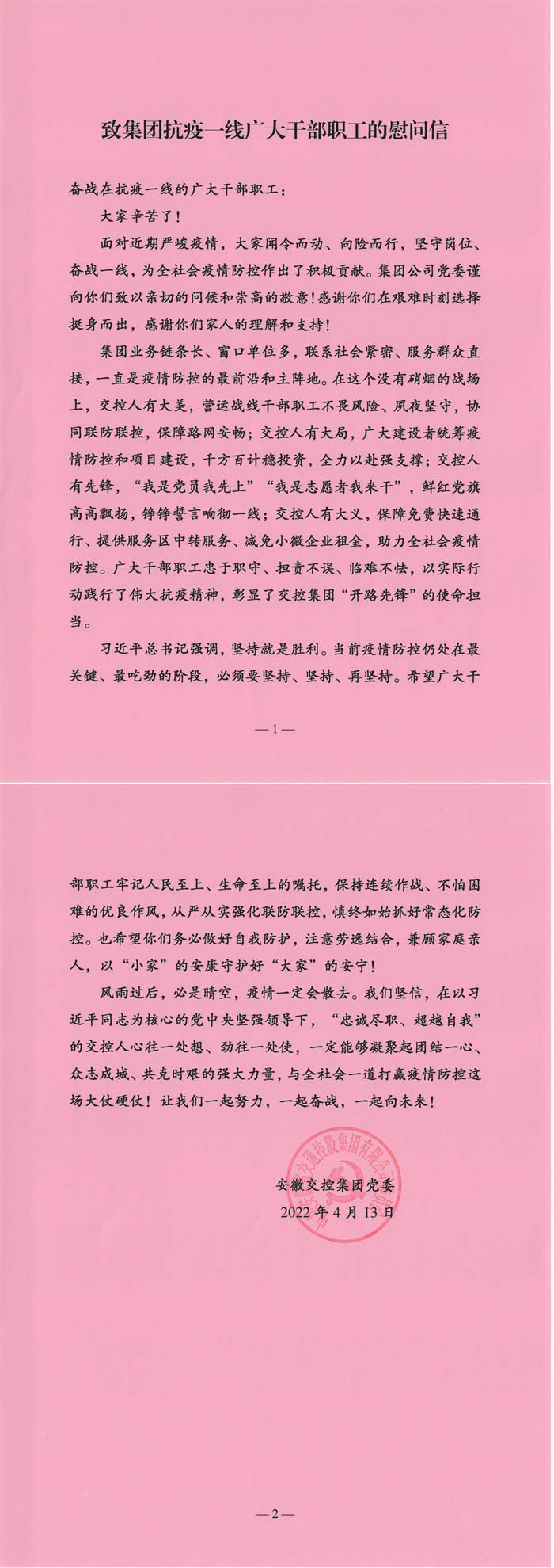 致集团抗疫一线广大干部职工的慰问信